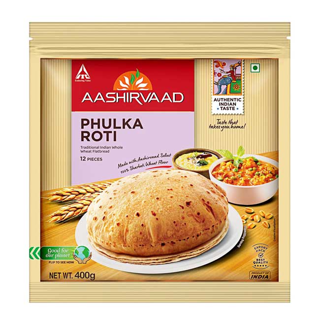 Ashirvaad Phulka Roti 360g includes 12 frozen, ready-to-cook whole wheat flatbreads. Soft, thin, and easy to prepare, these rotis puff up when heated and are perfect with any Indian curry, dal, or vegetable dish. Simply heat and serve in