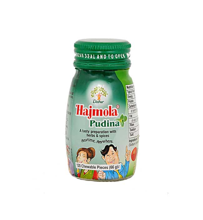Hajmola ist eine wohlschmeckende Verdauungssüßigkeit aus verschiedenen traditionellen ayurvedischen Kräutern. Dabur Hajmola Pudina ist ein Verdauungsbonbon mit Minzgeschmack, das in Südasien weit verbreitet ist, um die Verdauung anzuregen.