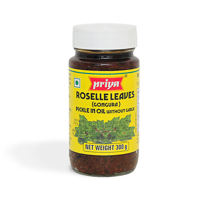 Gongura (Sorrel Leaves) is a green leafy vegetable commonly consumed in India as curry, but as well pickled. Gongura is known as Ambade bhaji in Marathi, Pulichakeerai in Tamil and Pundi pale in Kannada. Gongura pickle by Priya brings an authentic taste of South Indian pickle, especially popular in Andhra Pradesh. This Gongura pickle does not contain garlic.